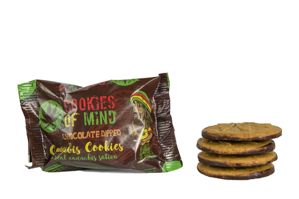 Ciasteczka Cookies of mind z nasionami konopi włóknistych w polewie czekoladowej.