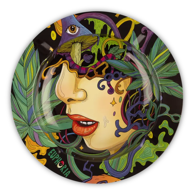 Popielniczki metalowa ozdobiona charakterystyczną grafiką Euphoria. Lekka, łatwa w czyszczeniu i idealna do codziennego użytku — praktyczne akcesorium o odważnym wzornictwie.