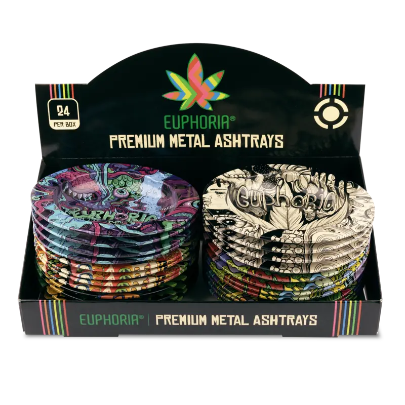 Popielniczki metalowa ozdobiona charakterystyczną grafiką Euphoria. Lekka, łatwa w czyszczeniu i idealna do codziennego użytku — praktyczne akcesorium o odważnym wzornictwie.