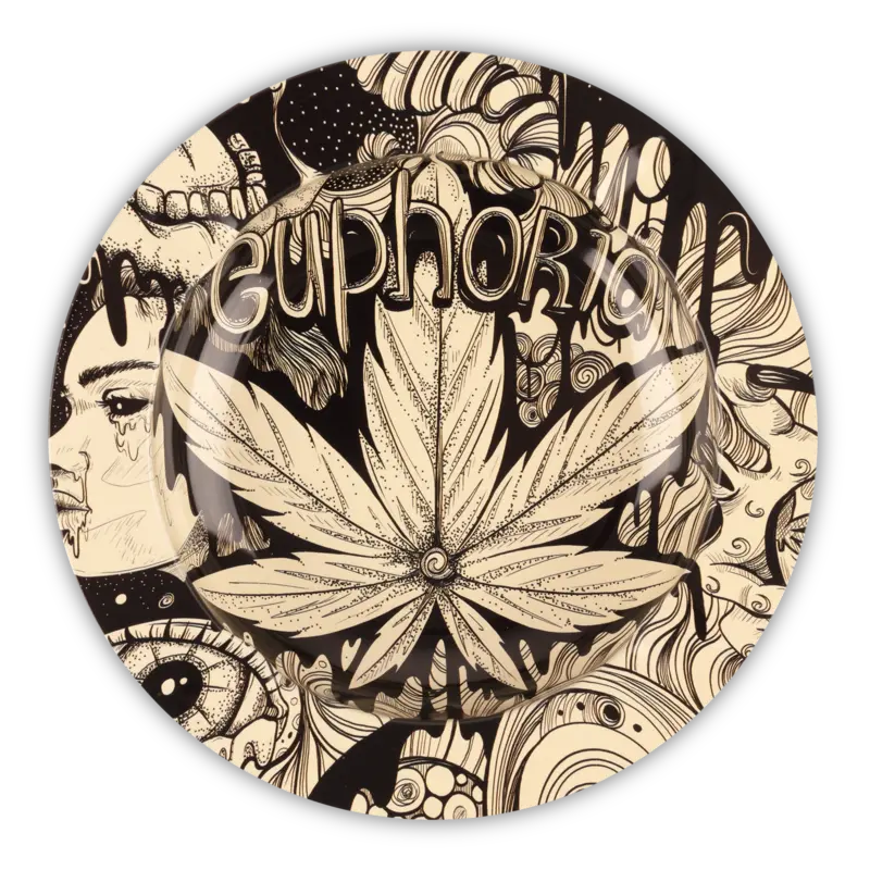 Popielniczki metalowa ozdobiona charakterystyczną grafiką Euphoria. Lekka, łatwa w czyszczeniu i idealna do codziennego użytku — praktyczne akcesorium o odważnym wzornictwie.