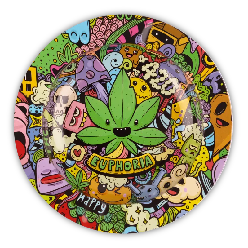 Popielniczki metalowa ozdobiona charakterystyczną grafiką Euphoria. Lekka, łatwa w czyszczeniu i idealna do codziennego użytku — praktyczne akcesorium o odważnym wzornictwie.