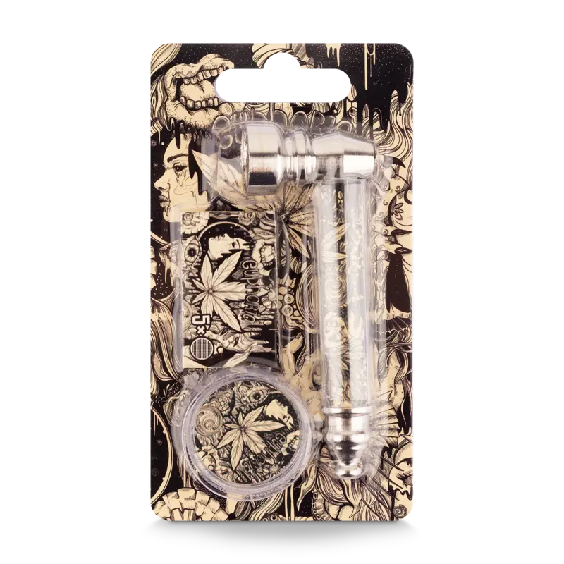 Kompaktowy zestaw typu „wszystko w jednym”, zawierający metalową fajkę, mini młynek i sitka (filtry) do fajki. Zaprojektowany z myślą o łatwej obsłudze i codziennym użytkowaniu.